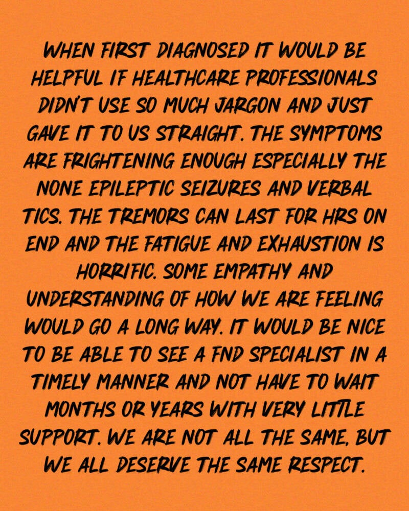 If you really want to understand FND.. how it works, how it feels, how it changes lives.. you need to listen to the people who live with it. We don’t get breaks. No days off. No time to pause. We are the constant in this condition. You want insight? We have it. You want to make a difference? Start with us.